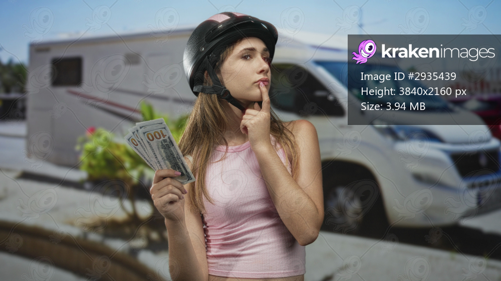 Woman holding stacks of hundred dollar bills and finger to lips on street beside camper van while wearing a helmet; playful secrecy.