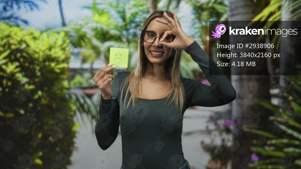 Woman holding sticky note with sad face and making ok sign with hand at eye on street; playful irony.
