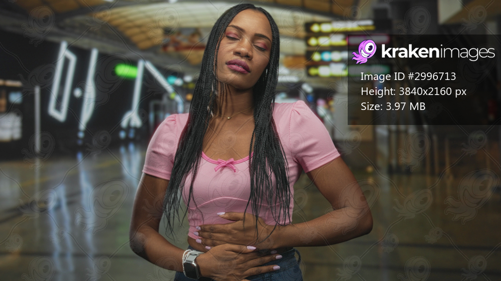 Woman holding stomach with hands clasped over midriff in airport terminal, eyes closed and slight grimace; pain fatigue.