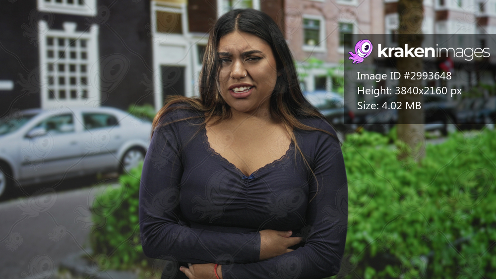 Woman holding stomach and wincing on a residential street sidewalk lined with rowhouses and parked cars; pain nausea.