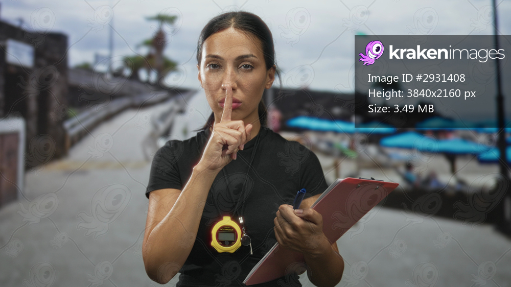 Woman holding stopwatch and clipboard, finger to lips for silence while overseeing beach activity on seaside promenade; discipline focus.