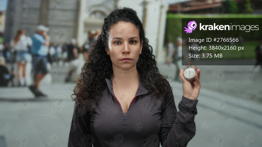 Woman holding stopwatch outside with leaning tower of pisa in background, surrounded by people, outdoor, tourist, hispanic, time, italy, travel, landmark. - Kraken Images
