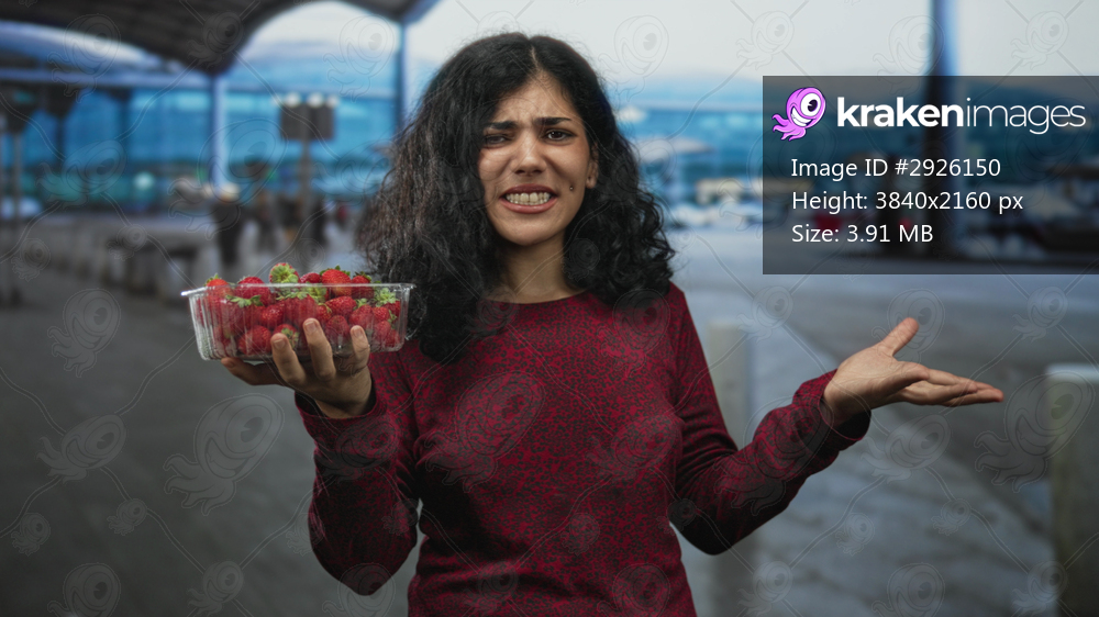 Woman holding strawberries at airport holds out container and touches head with other hand; travel frustration.