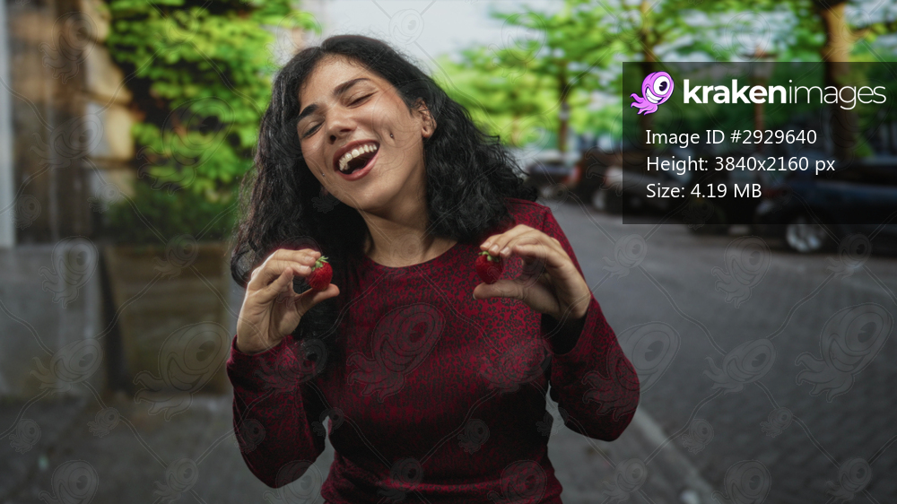 Woman holding strawberries with both hands on a city street wearing a red sweater and smiling broadly; joy playful fun laugh.