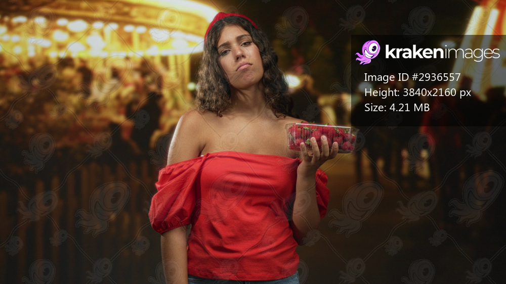 Woman holding strawberries in a clear plastic punnet with bare shoulder exposed, hand raised in a presenting gesture at a street carnival at night; melancholy solitude. - Kraken Images
