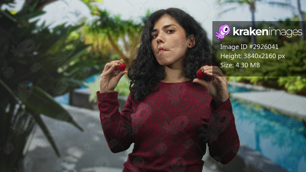 Woman holding strawberries near face at a hotel pool with puckered lips and closed eyes; playful curiosity.