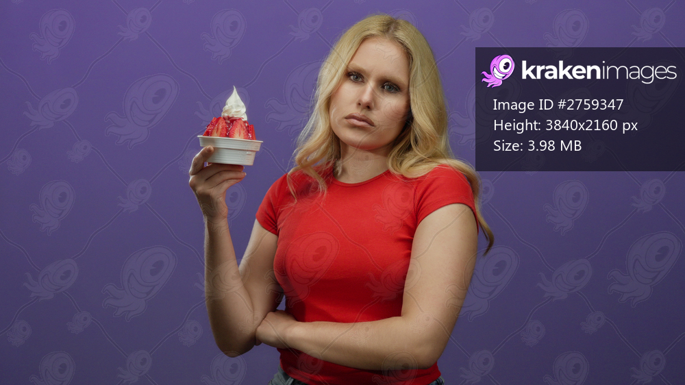 Woman holding strawberry ice cream against vibrant purple background with a thoughtful expression and casual red outfit, embodying a mood of contemplation and inquiry. - Kraken Images