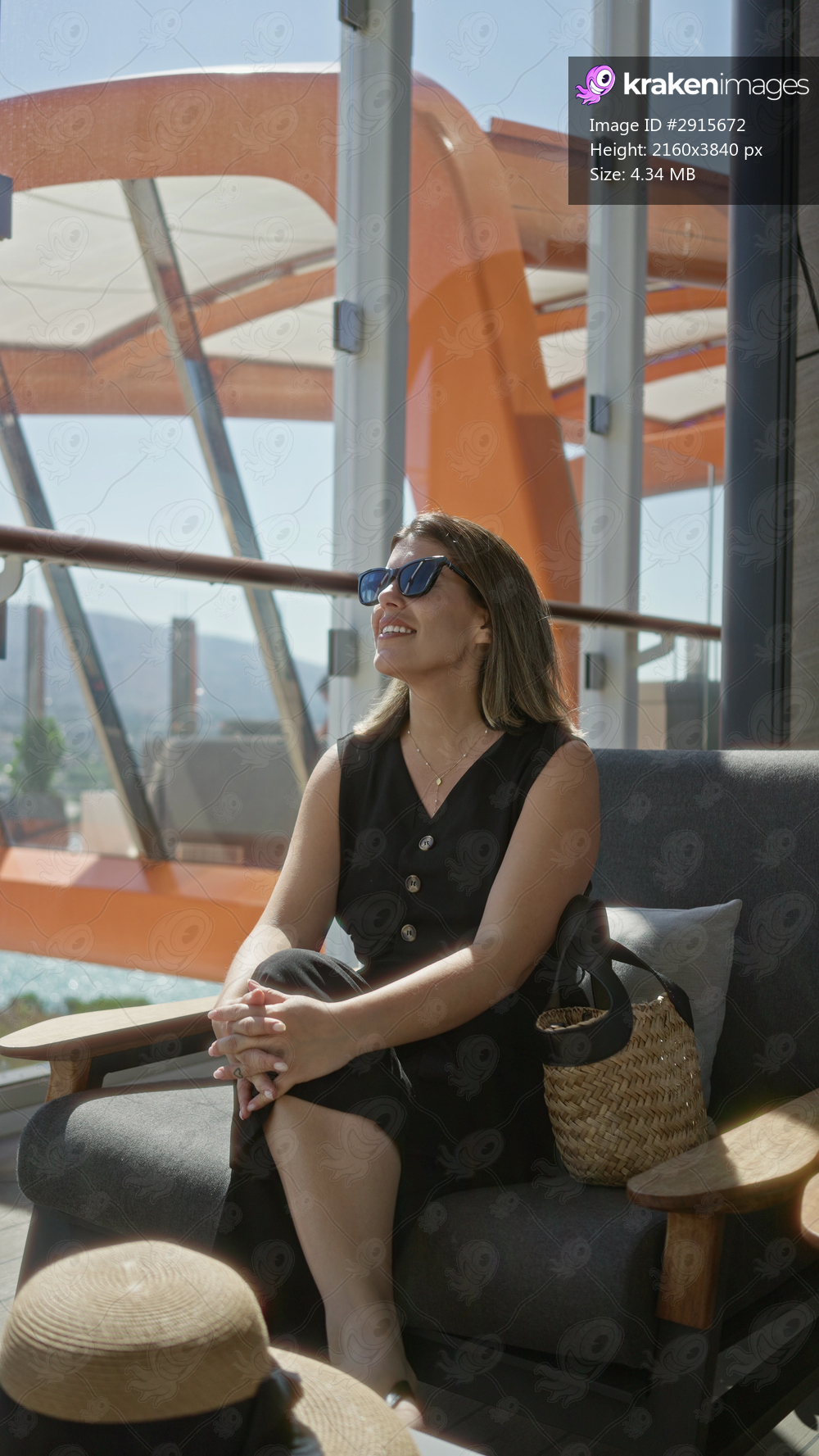 Woman holding sunglasses on cruise terrace lounge chair with straw bag and hat beside her while she sits and reaches toward hat; travel leisure calm.