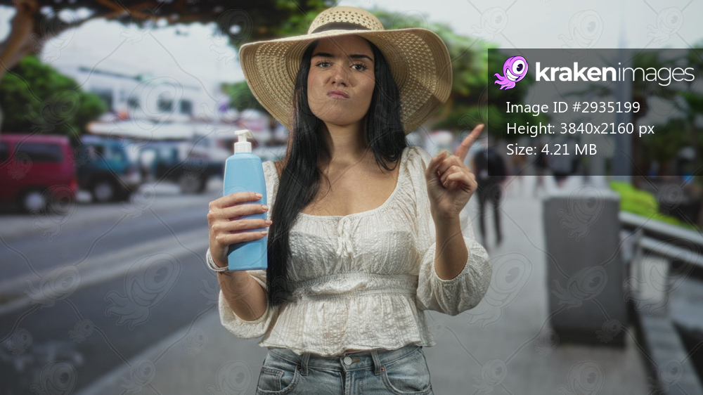 Woman holding sunscreen bottle in hand, pointing finger to the side on a street; concern sun protection travel.