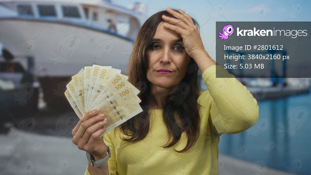 Woman holding swedish krona banknotes near a boat at the port, expressing various emotions as she stands by the seaside outdoors.