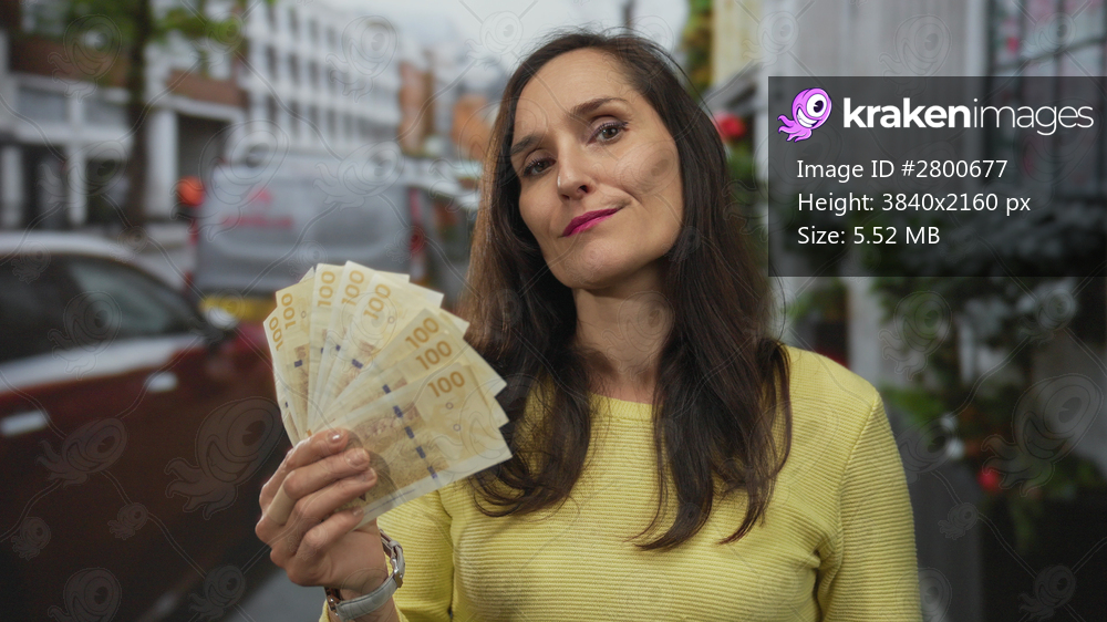 Woman holding swedish krona banknotes outdoors on a bustling street, showcasing money and finance in an urban setting with a confident expression.