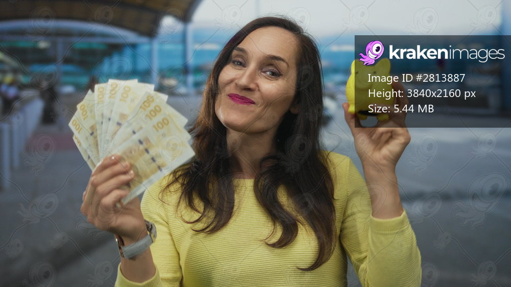 Woman holding swedish krona banknotes and piggy bank, smiling at the airport terminal outdoors.