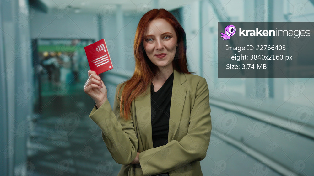 Woman holding swiss passport in airport terminal with a smile, standing in professional attire, emphasizing travel and identity verification.