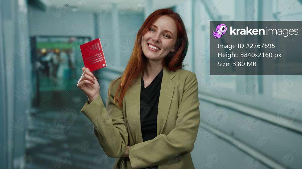 Woman holding swiss passport in airport terminal with a smile, standing in professional attire, emphasizing travel and identity verification.