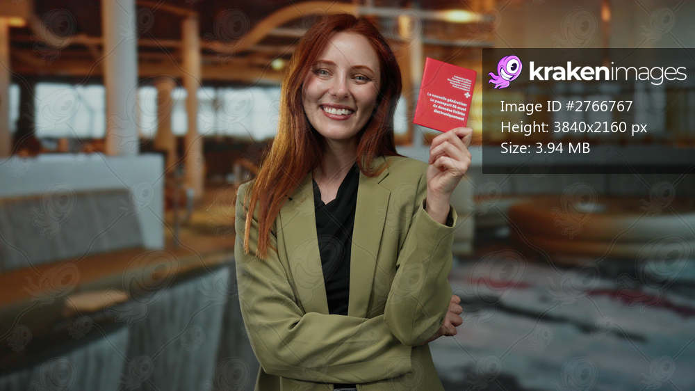 Woman holding swiss passport smiling confidently in modern restaurant setting with warm lighting showcasing relaxed atmosphere.