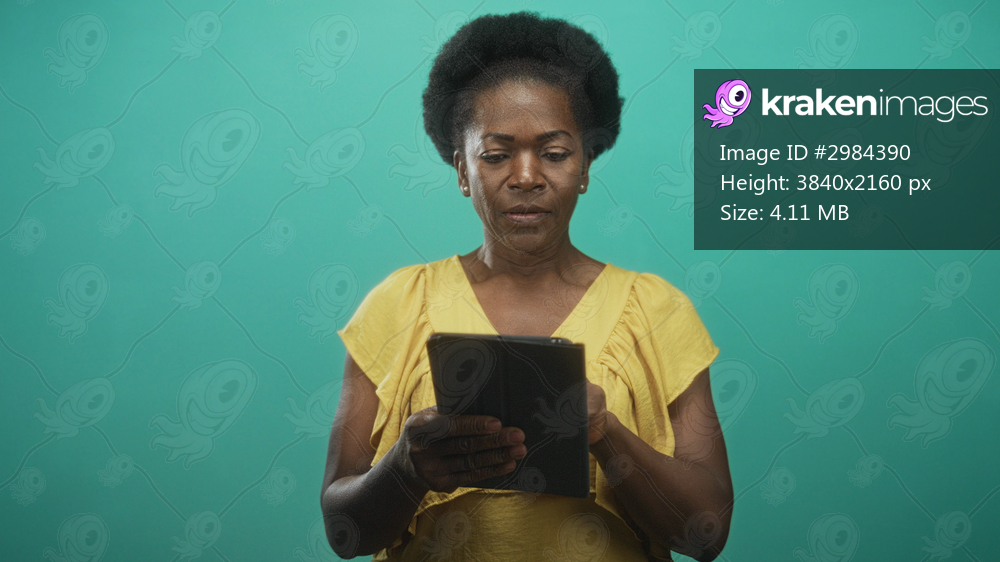 Woman holding tablet with both hands in studio, reading and softly tapping the screen; quiet concentration.