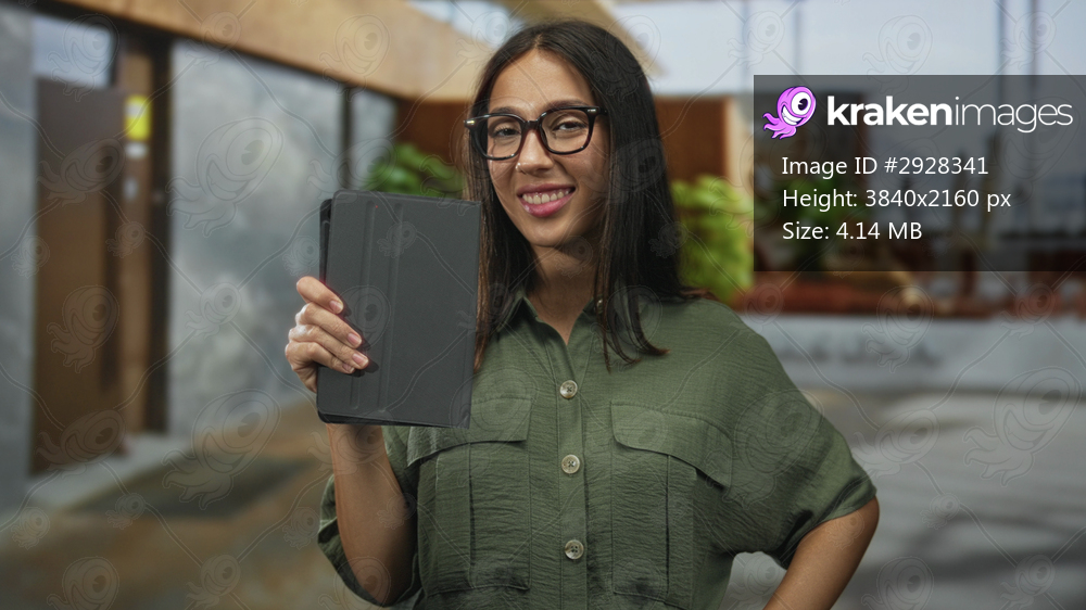 Woman holding tablet with closed cover at building entrance, wearing glasses and green shirt, smiling while posing; confidence.