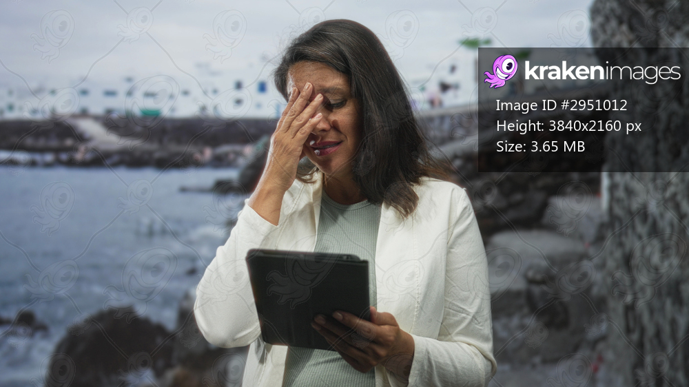 Woman holding tablet and clutching throat with clenched fist on street by rocky waterfront; frustration.
