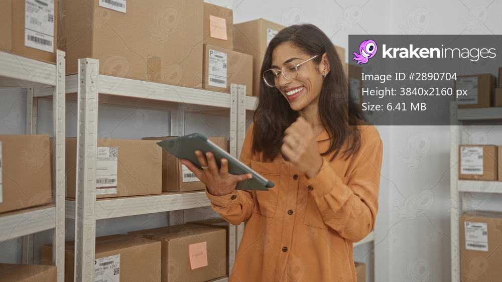 Woman holding tablet and fist pump gesture among parcel boxes in a storage building; small business success.