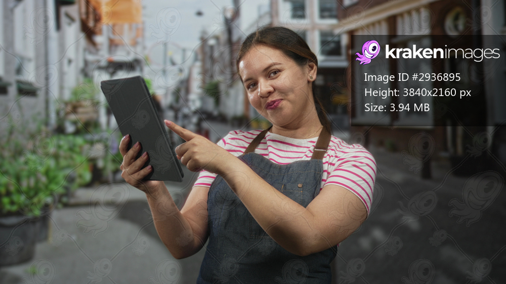 Woman holding tablet and giving thumbs up on street wearing denim apron and striped shirt; confidence local business support.