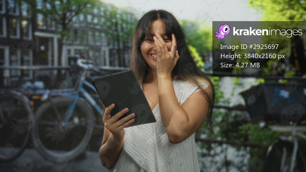 Woman holding tablet and hand covering face while smiling on a street by a canal in amsterdam outdoors; joy connection.