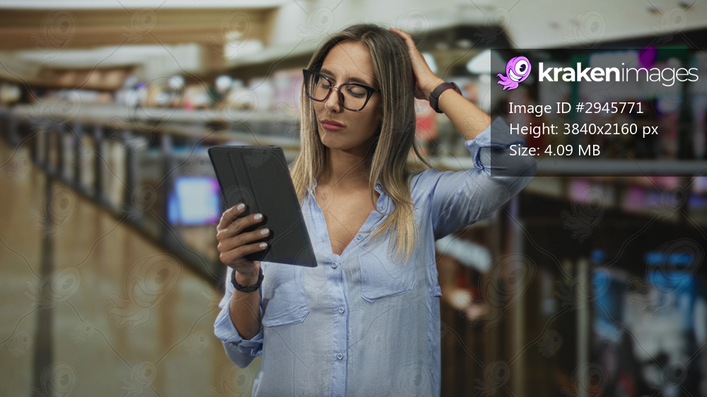 Woman holding tablet, hand on head, wearing glasses and light blue blouse in shopping building; confusion decision.