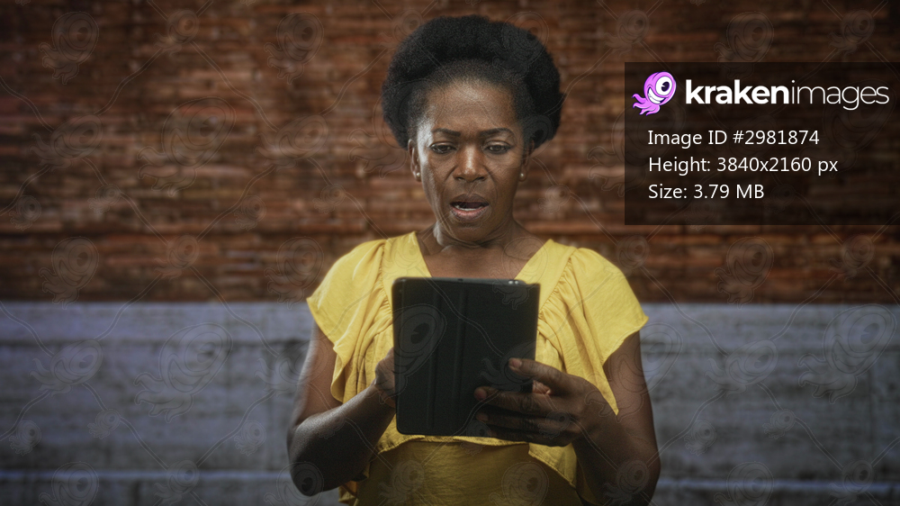 Woman holding tablet with hands visible, frowning while reading against a brick and concrete building wall; concern reflection.