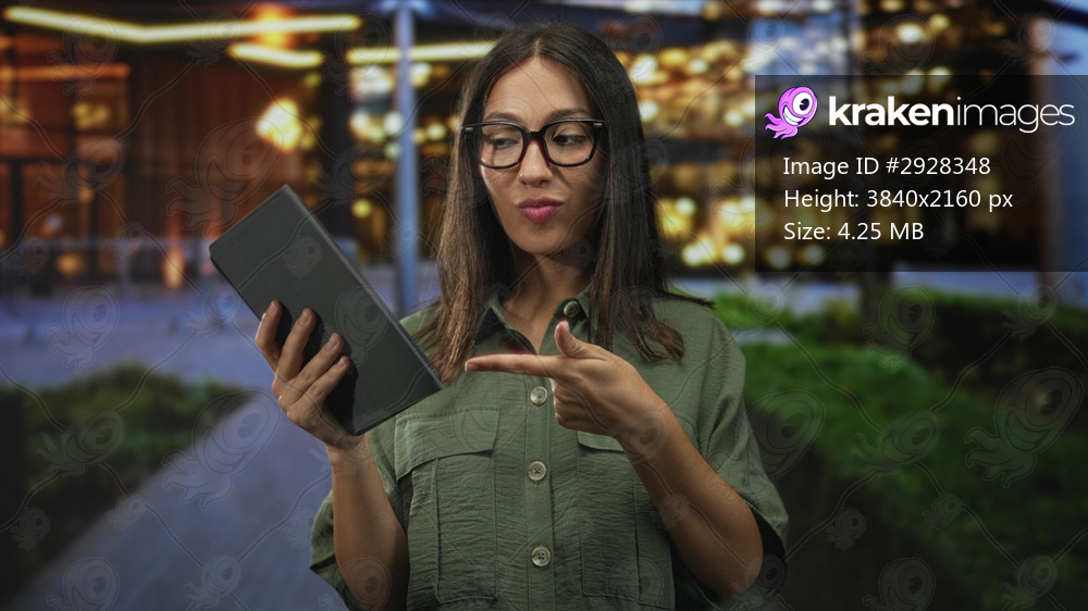 Woman holding tablet and pointing toward building entrance outside at night with glass facade and walkway; confidence technology.