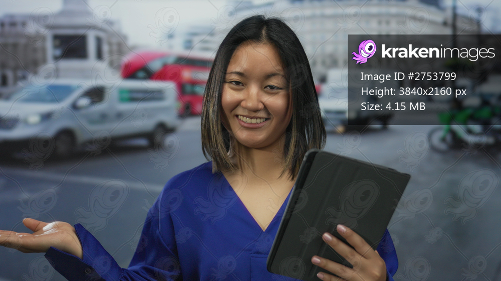 Woman holding tablet and presenting with hand on busy city street with traffic, wearing blue shirt, showing cheerful expression.
