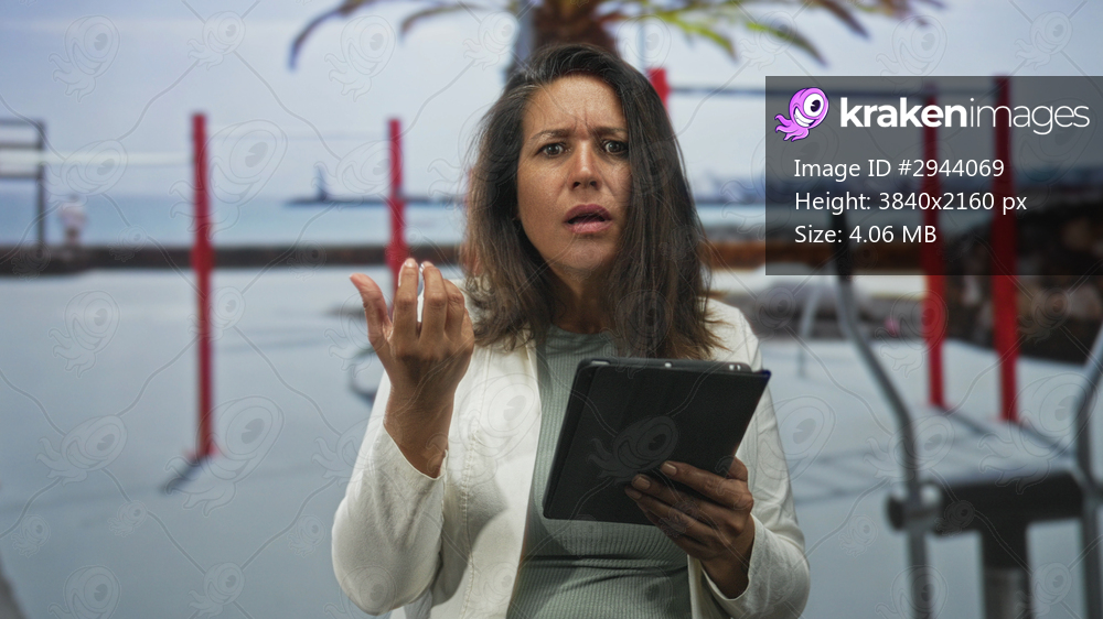 Woman holding tablet with raised hand gesture on street by outdoor fitness bars and sea; frustration confusion.