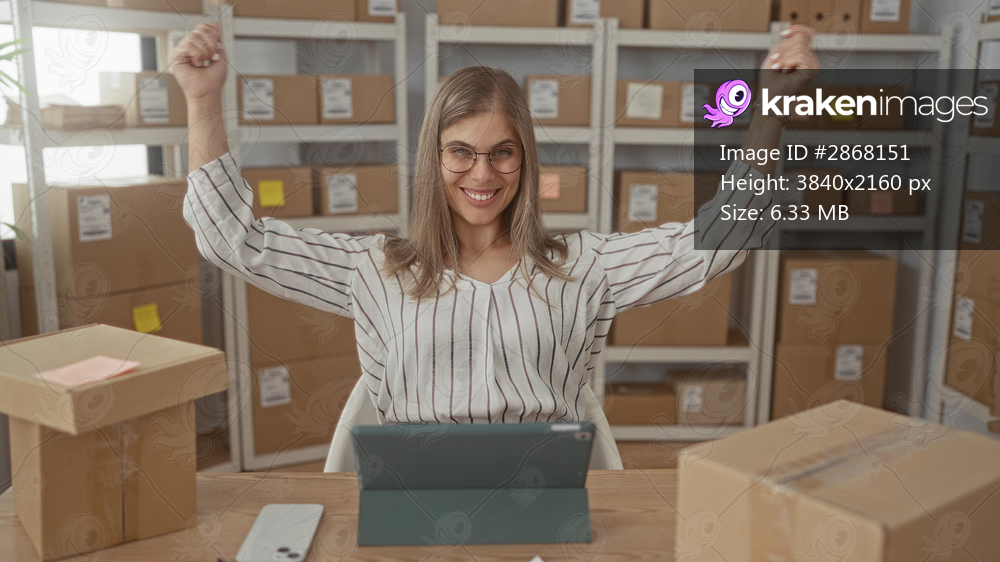 Woman holding tablet raising arms amid cardboard boxes in building storage facility; ecommerce celebration excitement.