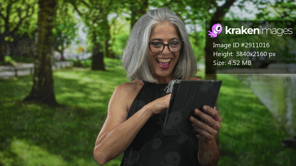 Woman holding tablet and smiling gives thumbs up in forest park with green trees and glasses; joy connection.