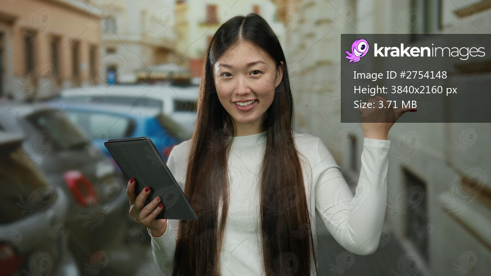 Woman holding tablet and smiling on urban street in city represents modern lifestyle in urban area during daytime.