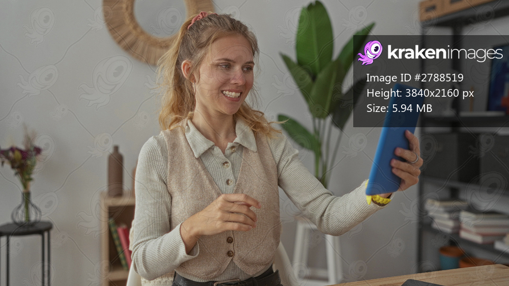 Woman holding tablet and waving in home setting while blonde young smiling host sits at desk in office during call.