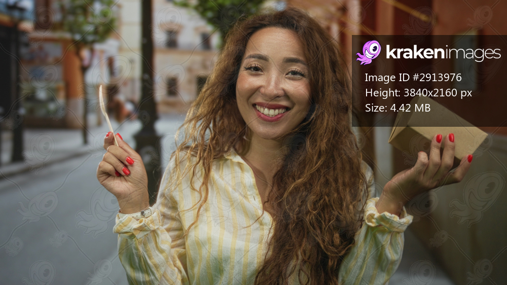 Woman holding takeaway box and fork on street smiling with visible face and hands; simple joy sharing.