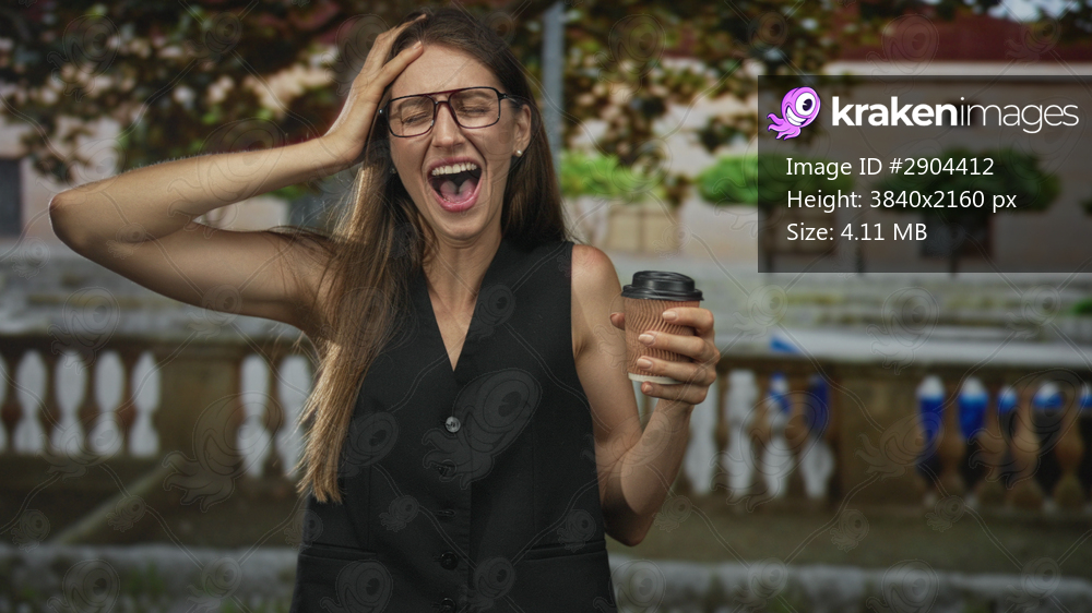 Woman holding takeaway coffee cup and raising hand near stone balustrade in front of building; commuter morning routine skepticism.