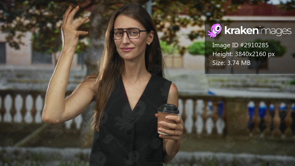 Woman holding takeaway coffee cup and raising hand near stone balustrade in front of building; commuter morning routine skepticism.