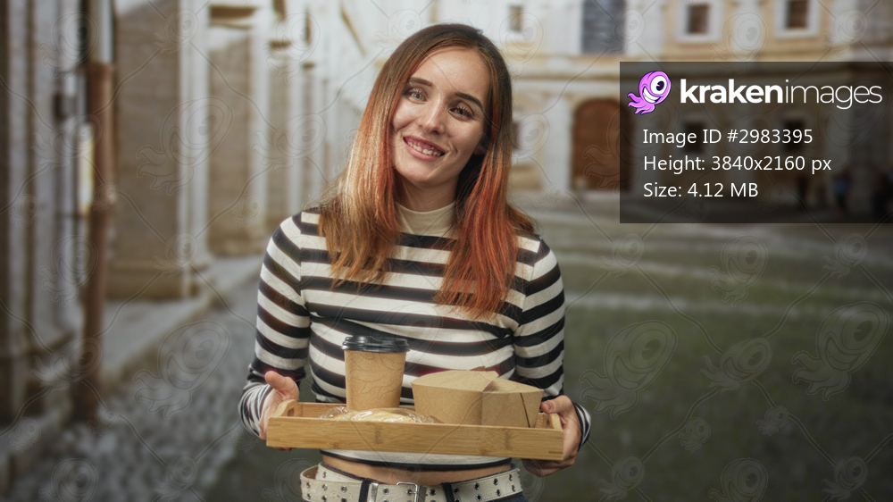 Woman holding takeaway tray with coffee cup and food boxes in a building courtyard; casual hospitality friendly.