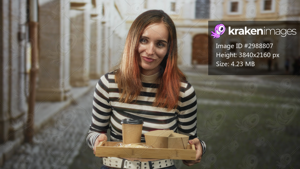 Woman holding takeaway tray with coffee cup and food boxes in a building courtyard; casual hospitality friendly.