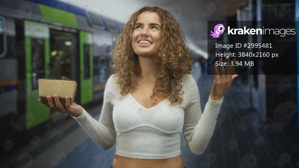Woman holding takeout delivery box while smiling and presenting with open hand gesture on a train platform inside a building, wearing a casual crop top; joy generosity. - Kraken Images