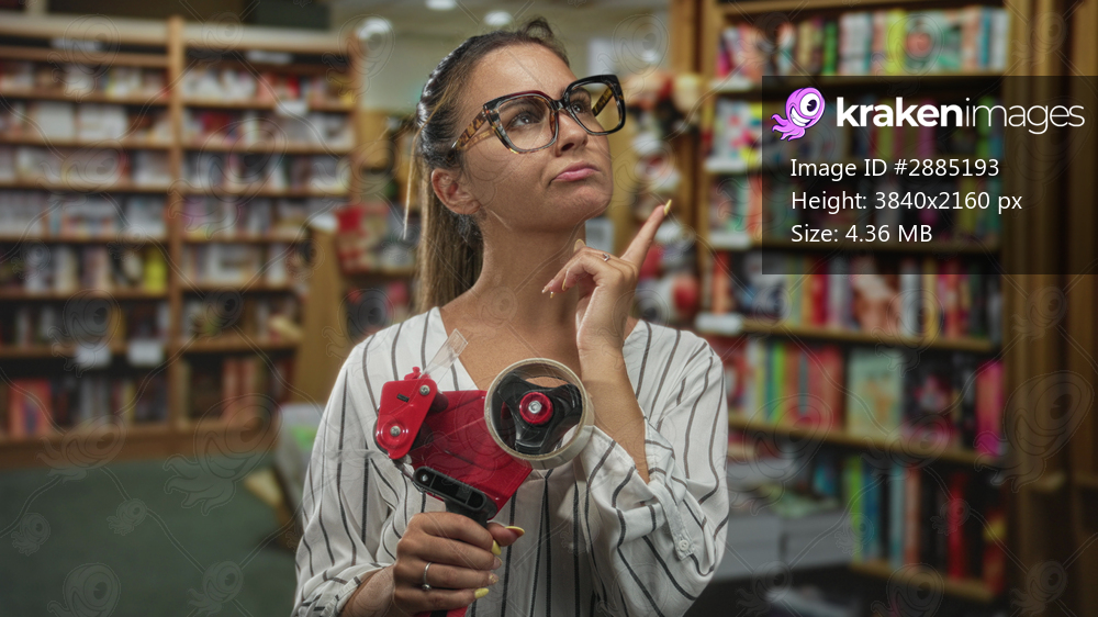 Woman holding tape dispenser and finger to cheek in library building, wearing glasses and striped shirt; curiosity decision.