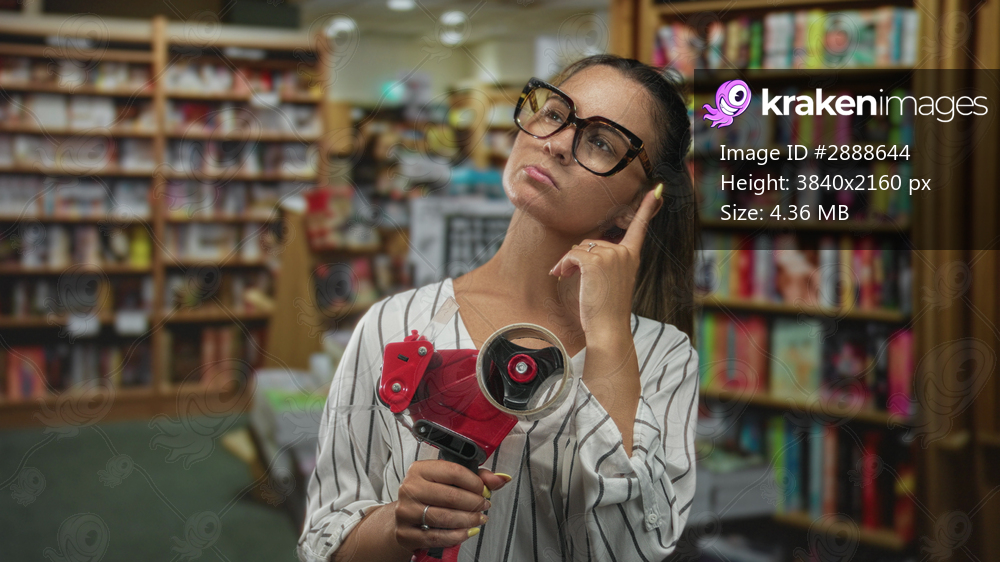 Woman holding tape dispenser and finger to cheek in library building, wearing glasses and striped shirt; curiosity decision.