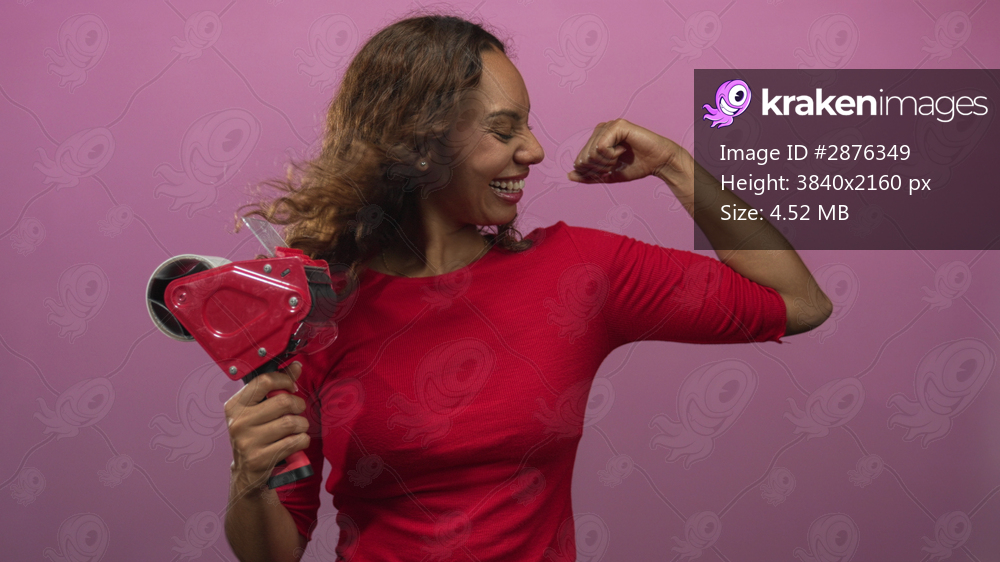 Woman holding tape dispenser and flexing bicep in studio with pink backdrop and broad laughing smile; confidence celebration.