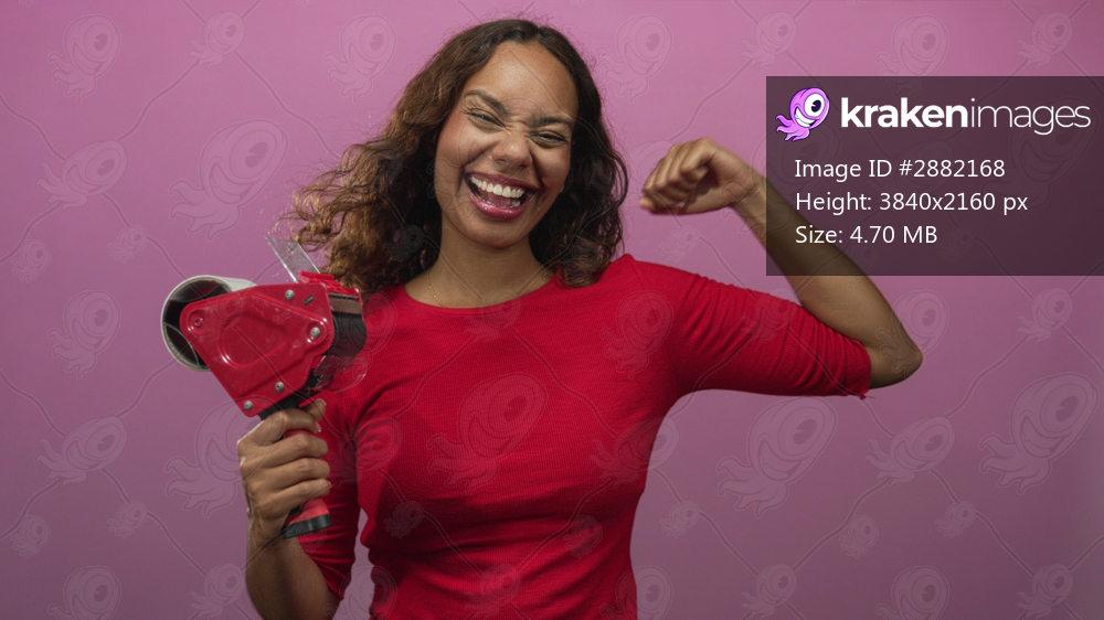 Woman holding tape dispenser and flexing bicep in studio with pink backdrop and broad laughing smile; confidence celebration.