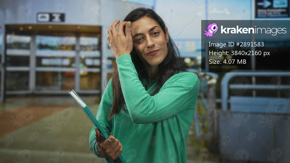 Woman holding teal notebook and touching hair at airport terminal entrance while smiling subtly; confidence travel ease.