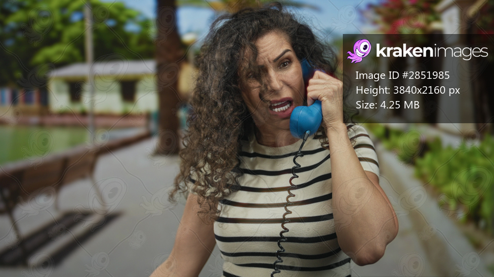 Woman holding telephone receiver to ear with hand on forehead in street; communication breakdown frustration.