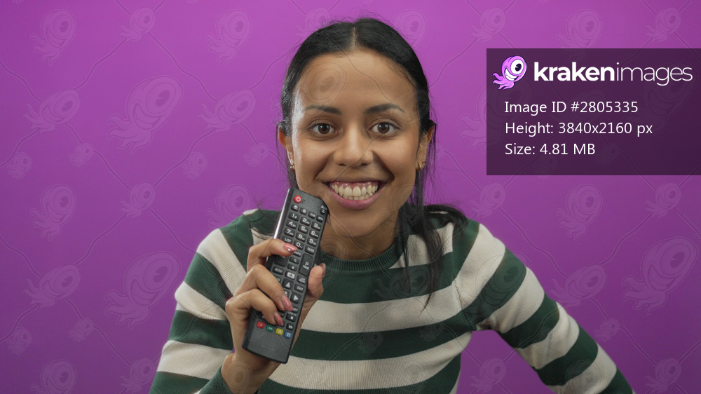 Woman holding television remote with excitement over pink background, expressing joyful anticipation in an isolated space.