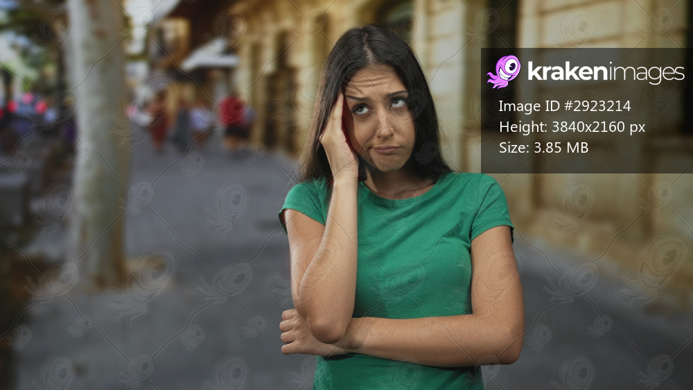 Woman holding temple with hand and arms crossed in green t shirt on street near stone building; frustration.