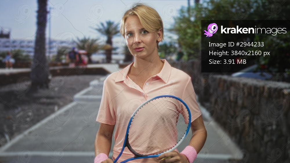 Woman holding tennis racket and ball, pink wristbands visible, standing on a palm lined street; confidence.
