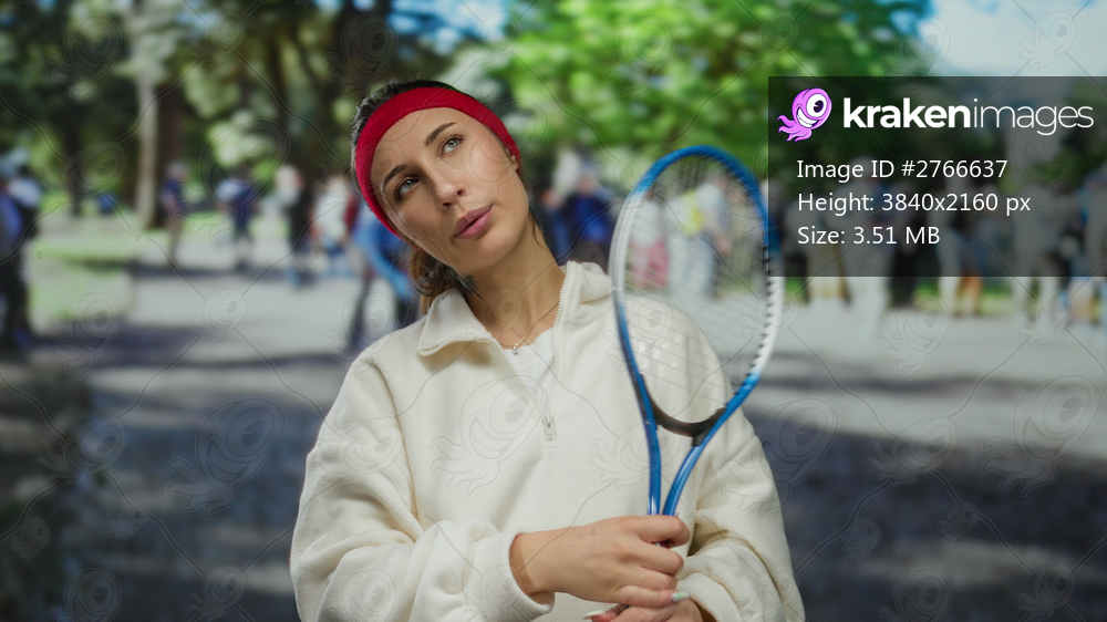 Woman holding tennis racket in outdoor park setting, dressed casually with green background, surrounded by people enjoying sunny day, conveying leisure and recreation. - Kraken Images